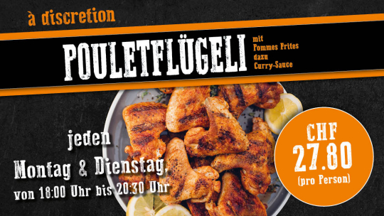 Pouletflügeli mit Pommes Frites dazu Curry-Sauce